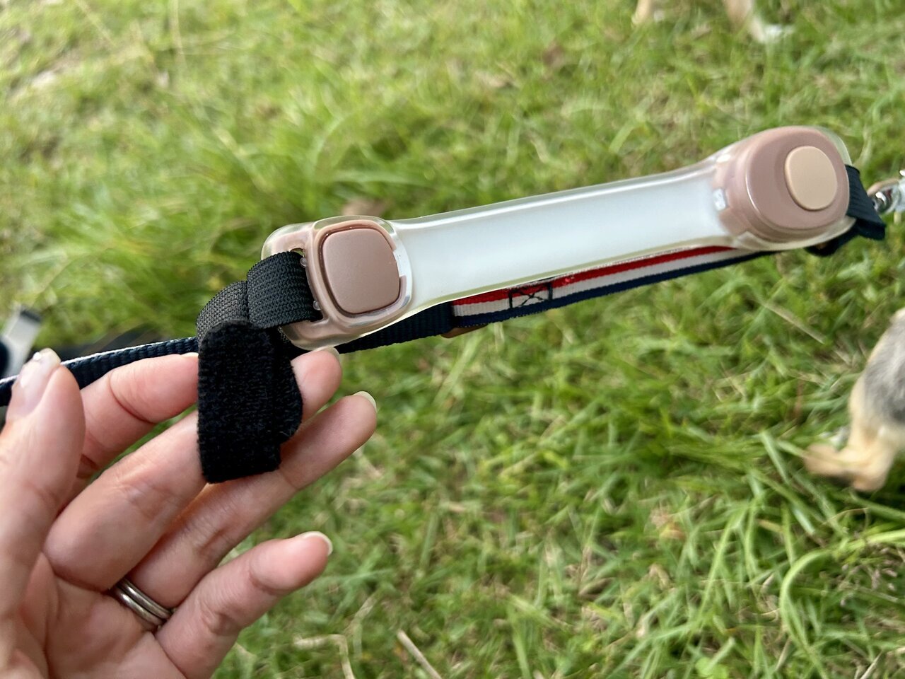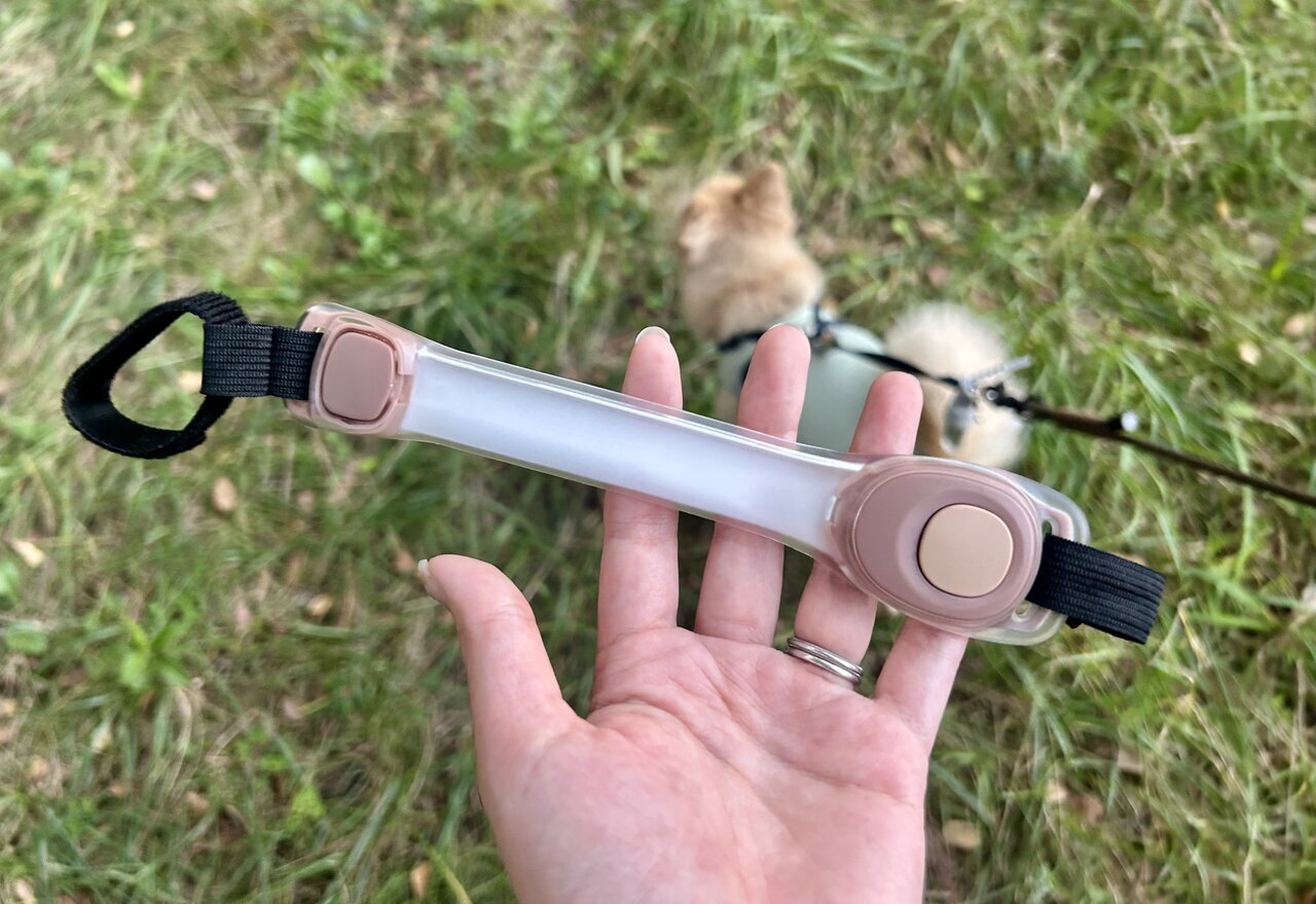 And the image above shows the "Walking Light" from 3COINS in an illuminated state. While it has a strong output, its length helps illuminate my dog's entire body.
