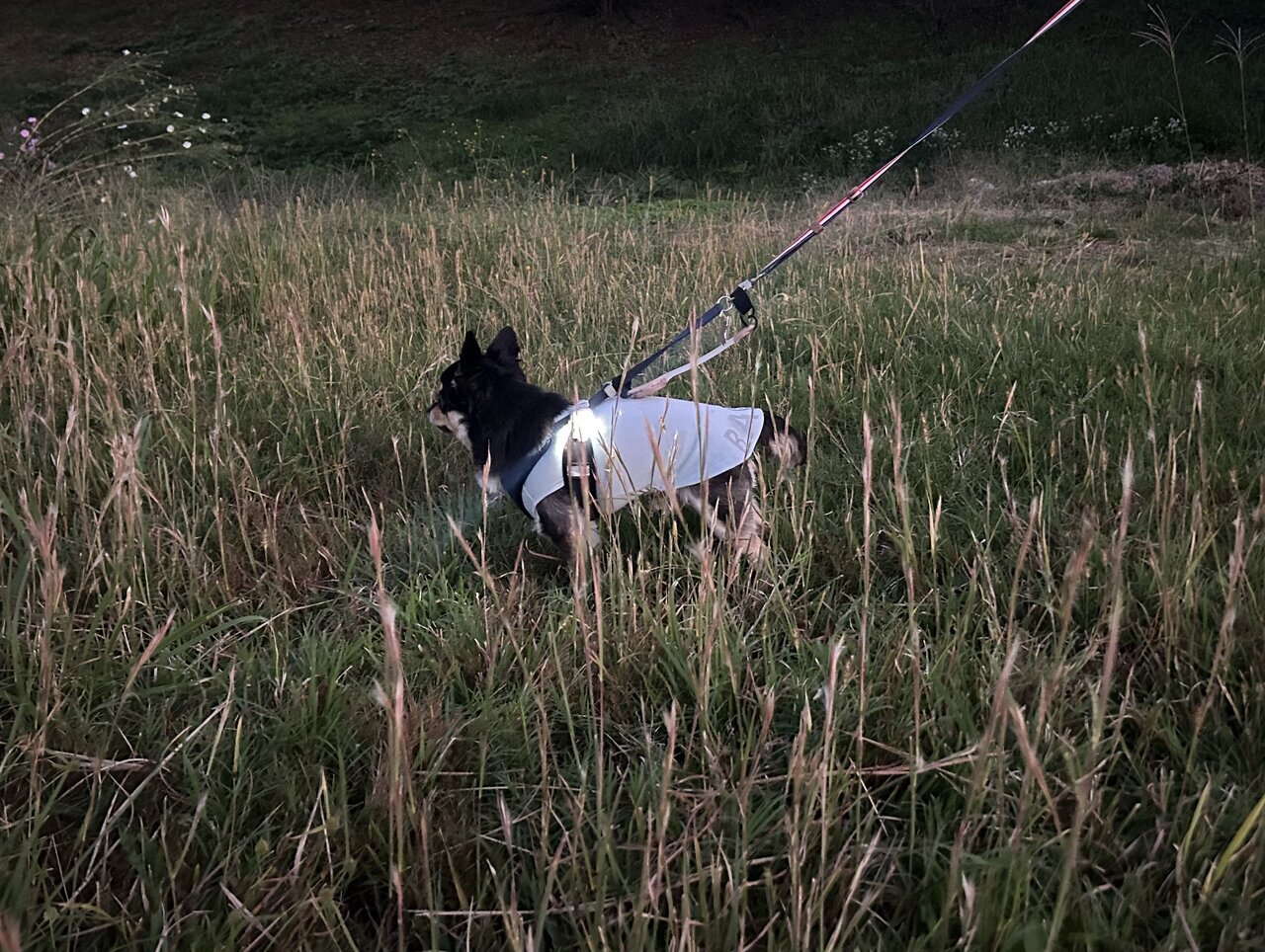 It might be a little hard to see in the photo, but in the dark, my dog's outline is clearly visible and stands out even from a distance. With this, any driver should be able to recognize my dog's presence.
