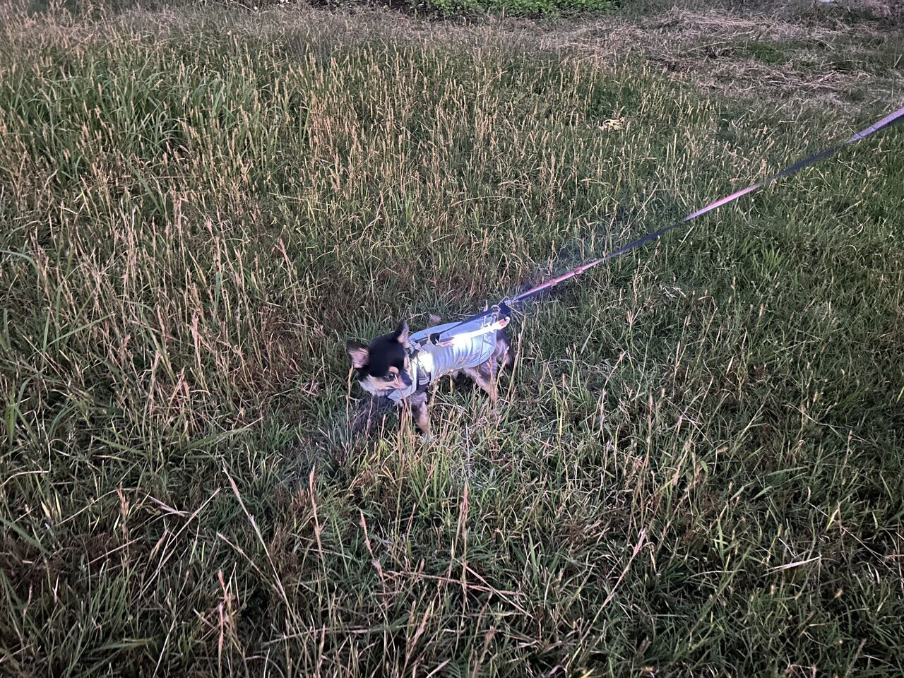The weight of the "Walking Light" is 41g. On the official 3COINS website, there were reviews stating it is "a bit heavy," but perhaps because it was worn on the leash, my dog (Chihuahua) didn't seem to mind it at all. Later, when I attached it directly to the harness, it seemed to feel uncomfortable and stopped several times. As expected, it seems better to attach it to the leash for small dogs.