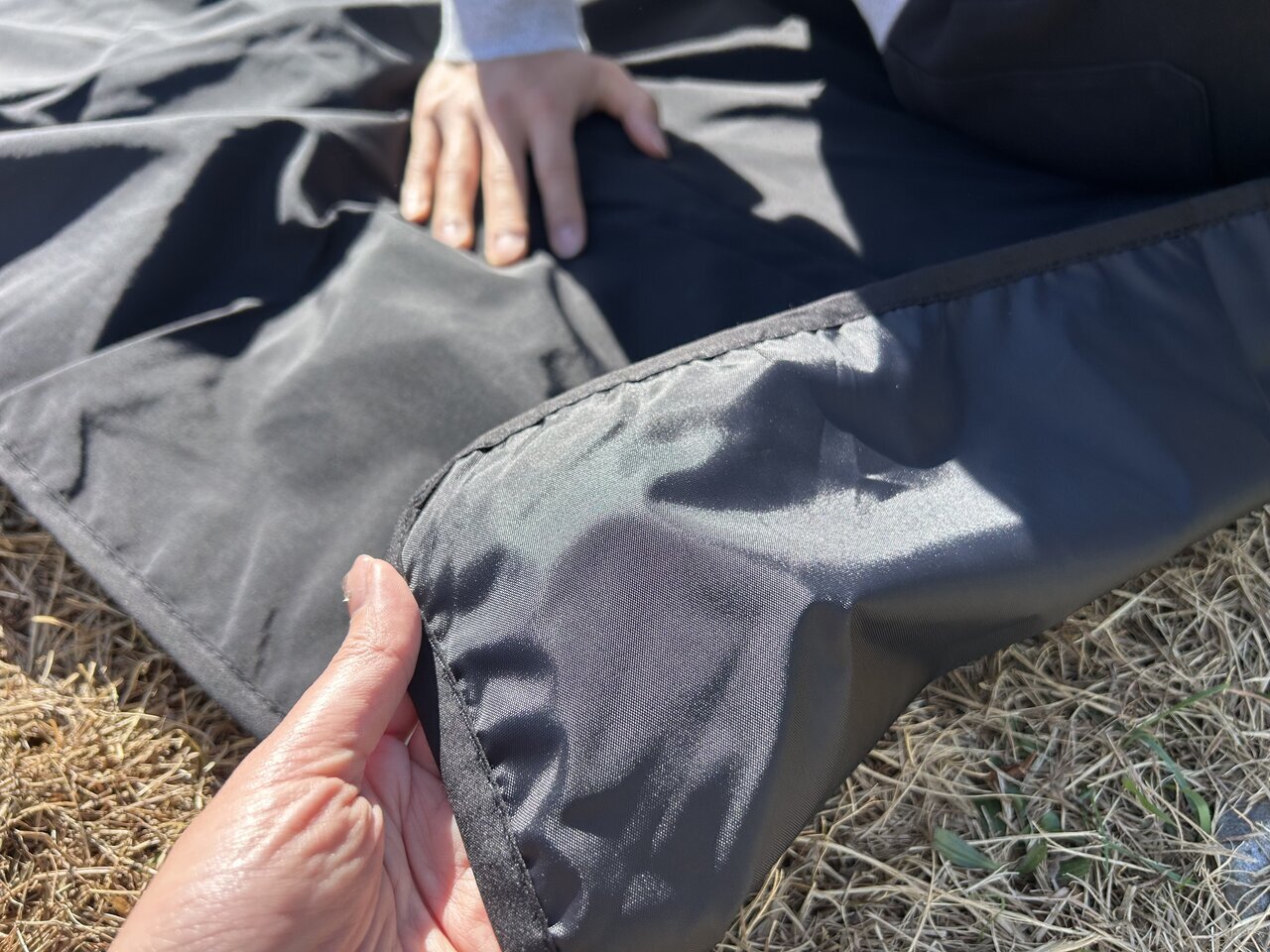 The official size is 100 × 140 cm. The material has nylon on the front and a polyester backing coated with aluminum. There was no mention of water resistance, but after actually using it, I found that it prevented a certain amount of water droplets.