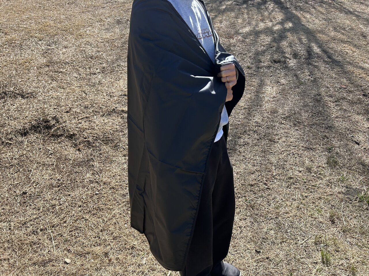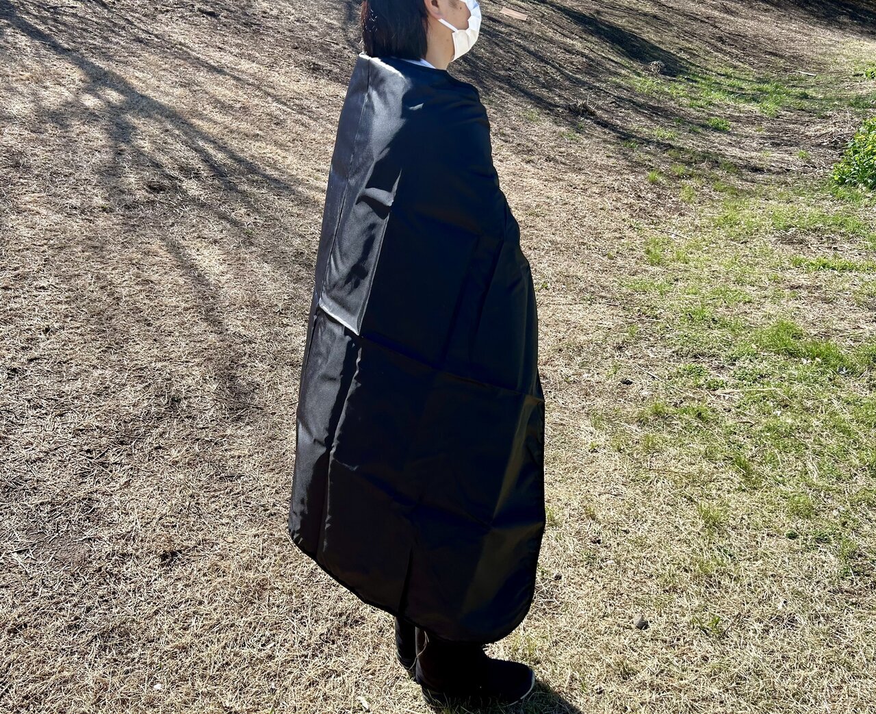 I tested its cold resistance. On this day, the wind was strong, and just putting on one layer shut out the cold wind and made me feel warm. Depending on height, even an adult man can comfortably cover down to the thighs with its size. Having this one piece can help protect body heat well when you're outside all day or during outdoor evacuations.