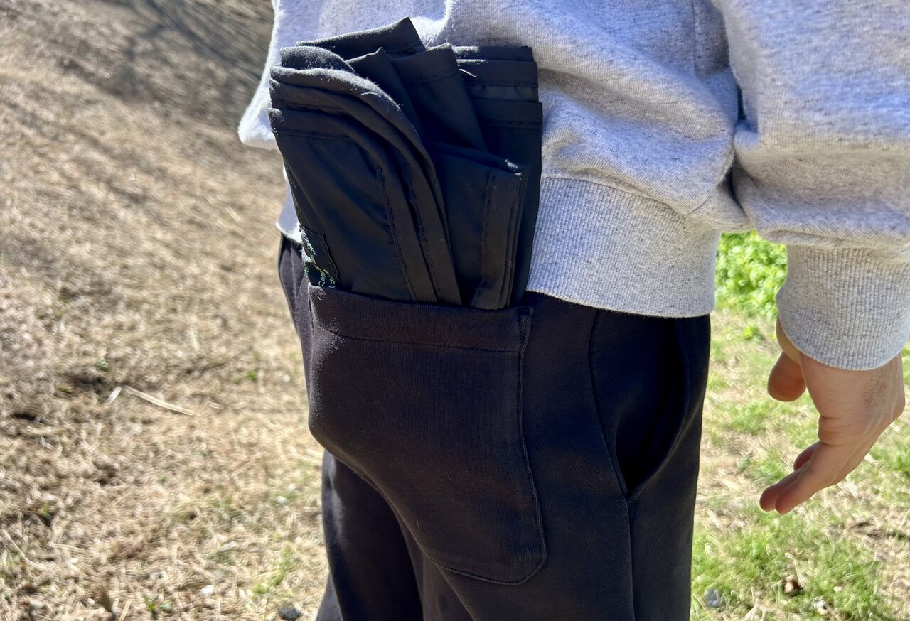 When storing it, brush off any dirt while folding along the creases. The fabric is slightly thick, so it fits snugly in a large pocket. It should be able to fit into a bag with pockets.