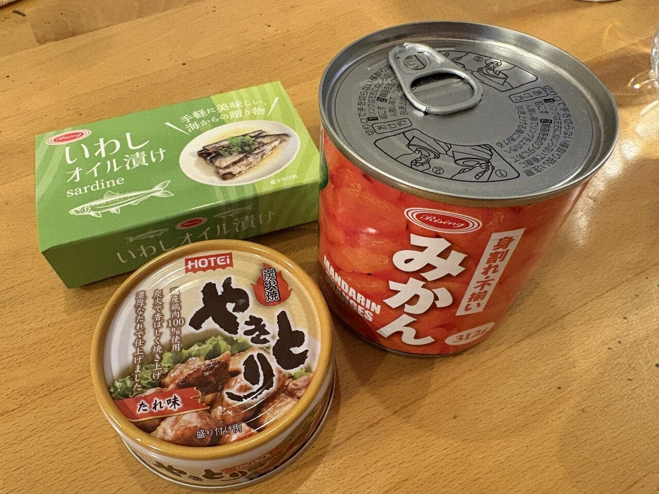 Therefore, we will intentionally plate some canned goods that could serve as emergency food. What I prepared are canned sardines in oil, grilled chicken skewers, and canned mandarins.