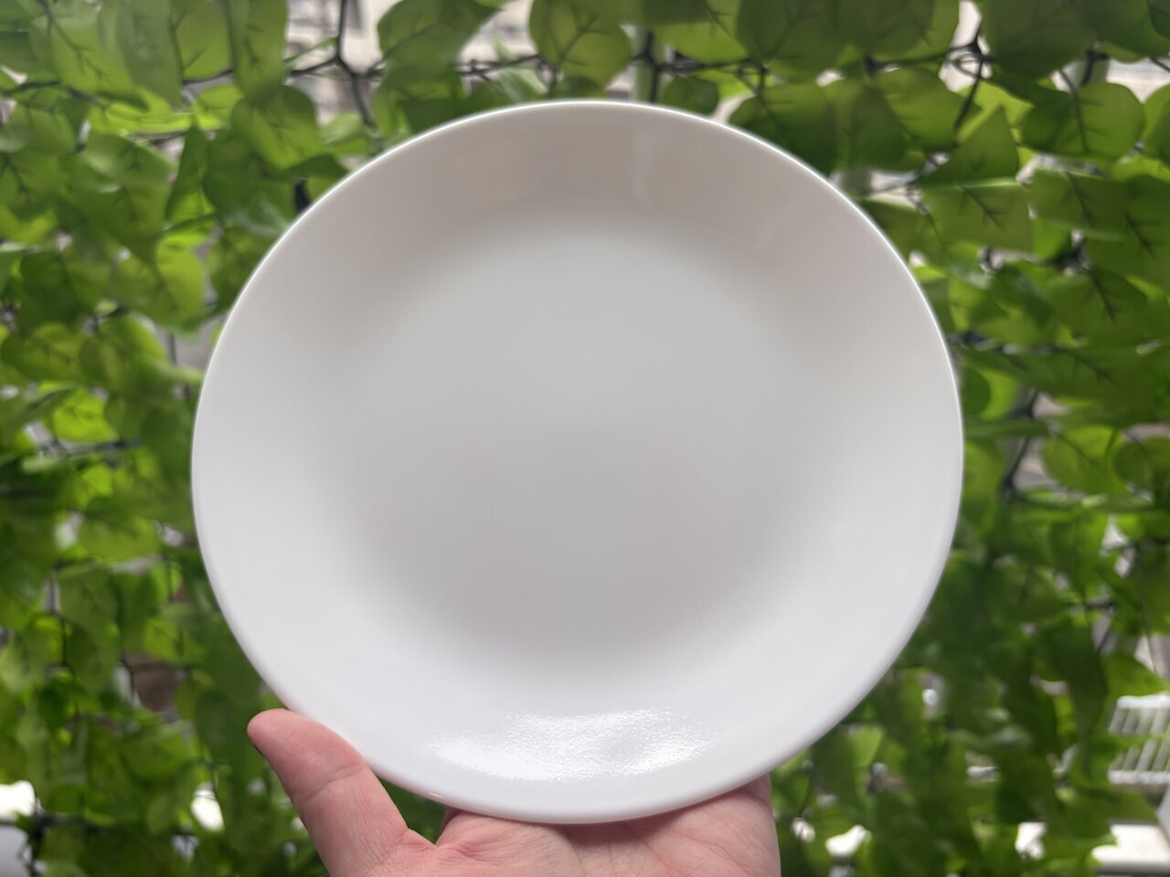 What I have prepared are Corelle medium plates and Nitori's plastic plates. Corelle is a strong glass material that is thin and 21cm in size. Nitori's plates are made of lightweight and easy-to-handle plastic, measuring 24cm in width. Both have a design suitable for everyday use, yet are unbreakable dinnerware.