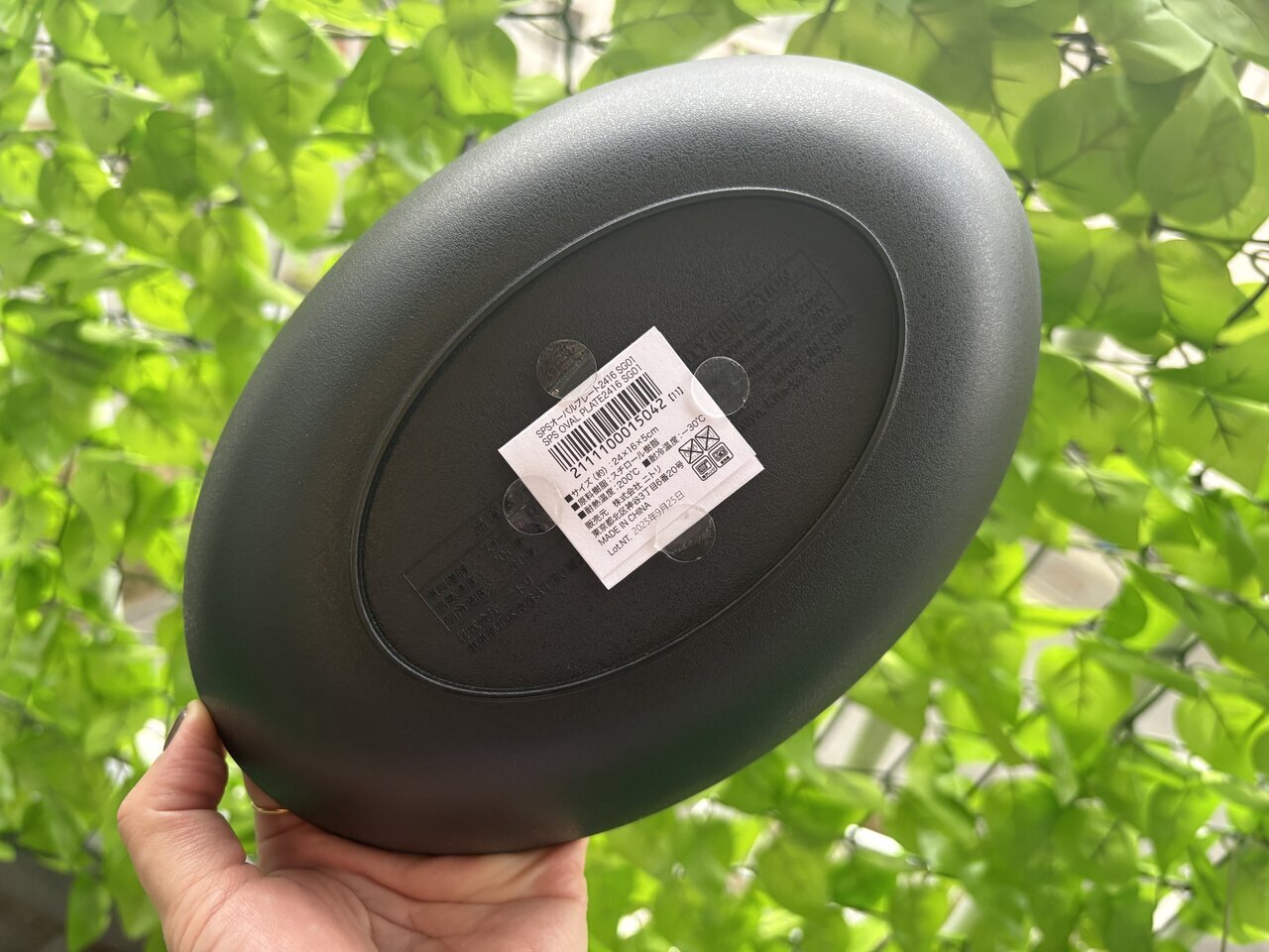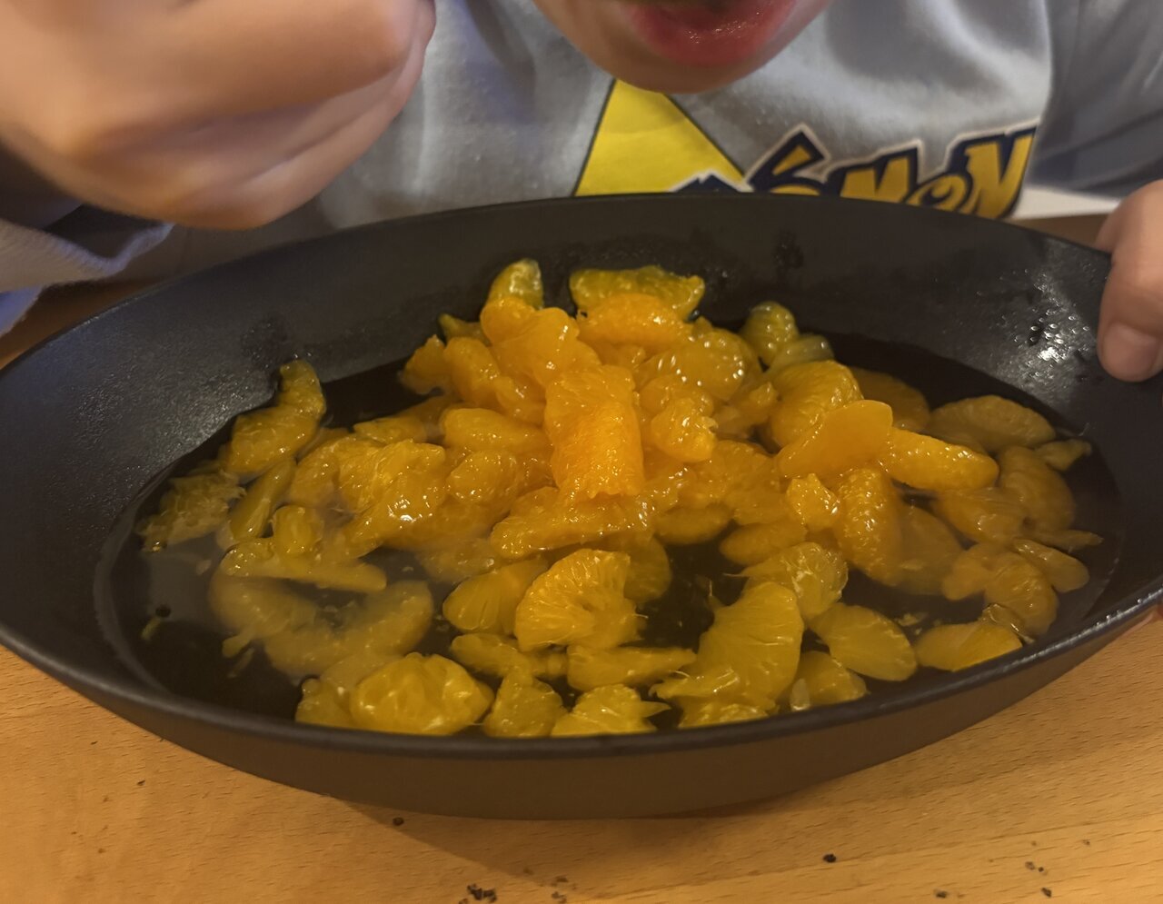 The black resin plate from Nitori is made of resin, so you can feel its lightness when picked up. The silver from the sardines and the contrast of the grilled chicken are clearly visible. It gives a sense of color enhancement. The canned oranges also appear vibrant, significantly changing the visual impression.