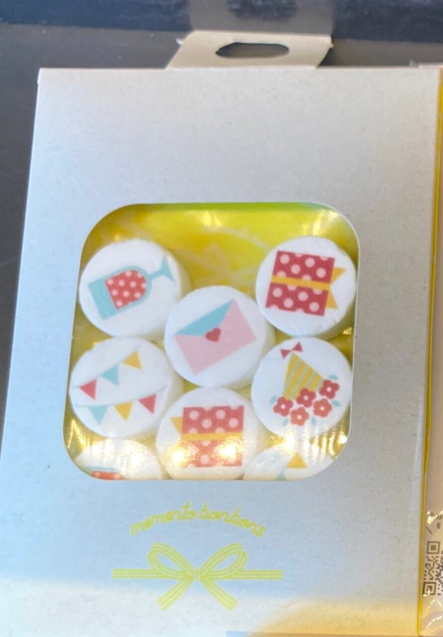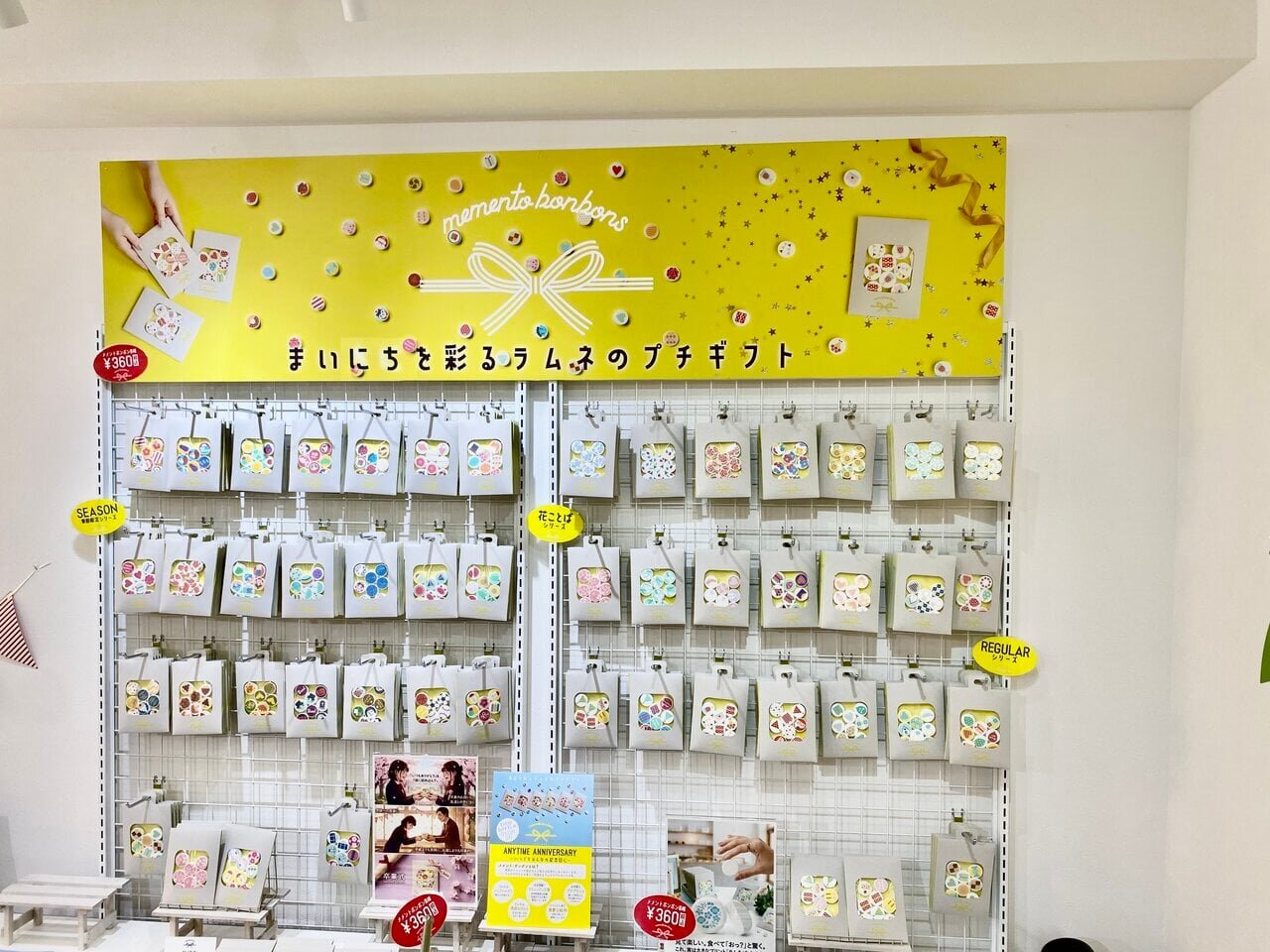 On the opposite wall, there is a colorful corner. In fact, everything here is ramune! Cute illustrations are printed on non-allergen ramune, about the size of a 500 yen coin. It seems to be manufactured in a "community factory" that supports employment for young people.