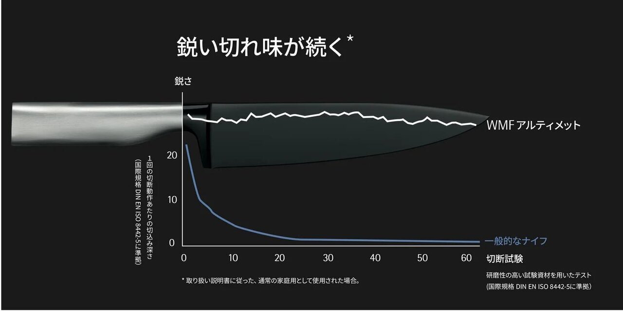 In cutting durability tests, it was compared with typical knives that require sharpening to maintain sharpness. The "Ultimate" has been confirmed to maintain sharpness even after repeated cuts (compliant with international standard DIN EN ISO8442-5).