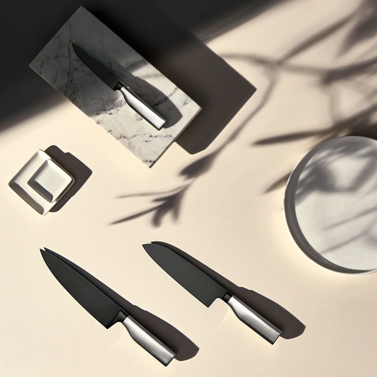 With a focus on design and usability, the luxurious design beautifully combines the black shining carbon material with silver stainless steel. The handle is ergonomically designed, making it easy to use for extended periods without fatigue. The combination of deep black carbon and high-quality stainless steel makes everyday cooking even more enjoyable.