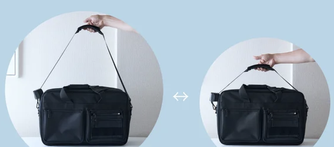 The shoulder belt feels a bit awkward. At times like this, having this retractable belt resolves the issue smoothly. Since the length can be adjusted freely, it doesn’t hang down, allowing for a versatile way to carry the bag.