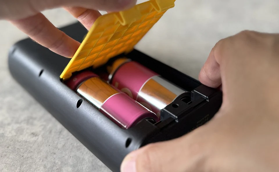 The color is black and yellow, and thanks to the yellow parts, it has excellent visibility even in the dark. The cover for inserting the batteries has a diagram indicating the orientation of the batteries, emphasizing its ease of use.