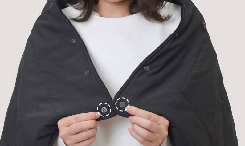 Can be fastened with a snap button, and when draped over the shoulder, it blocks cold at the shoulder. Additionally, when used as a knee wrap, it gently envelops the thighs and knees in warmth with "Hokamaru."
