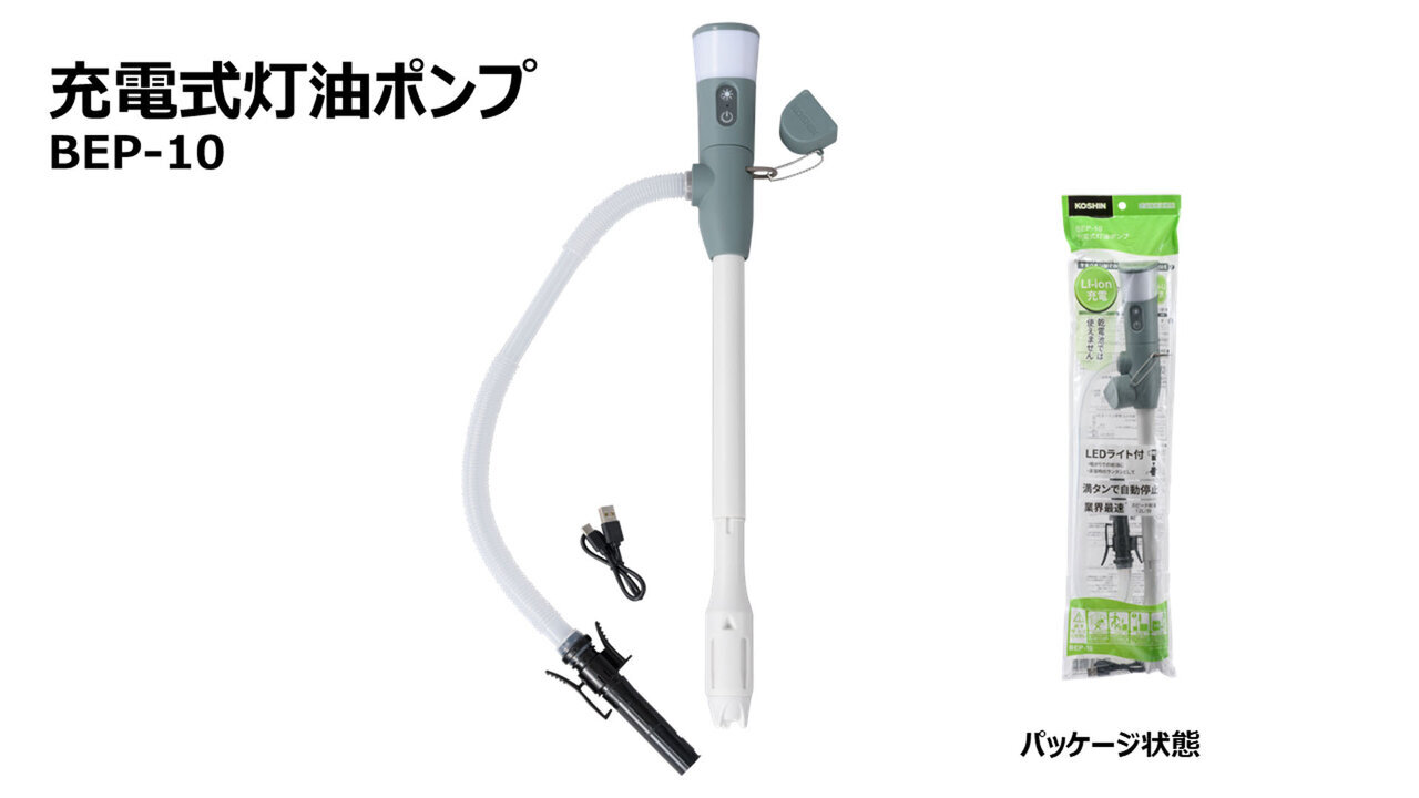 The "Rechargeable Kerosene Pump (BEP-10)" is a rechargeable kerosene pump that can refuel approximately 10L with just 1 minute of charging. It supports USB charging, eliminating the hassle of dead batteries. Developed by Koshin, a manufacturer that has provided a variety of products and services as a "pump expert" since its founding in 1948. This can be used with peace of mind.
