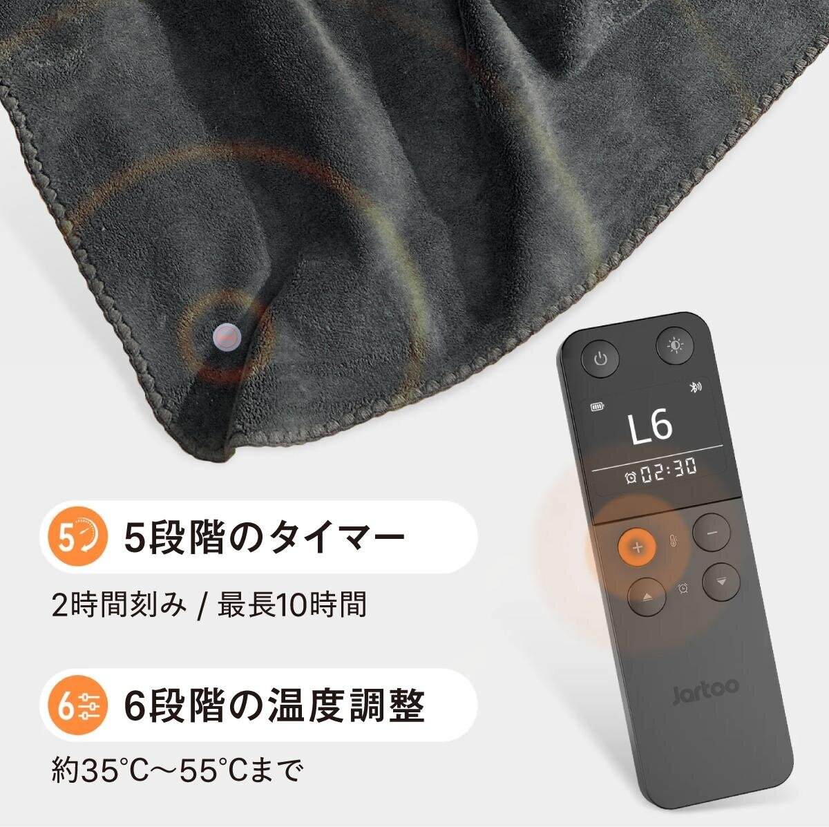 Operation is as simple as the press of a switch. The included remote makes it easy to set the temperature and timer. The temperature can be adjusted in 6 levels, and the timer in 5 levels, allowing for detailed customization. You can use it safely for preheating while sleeping or to combat nighttime chill.