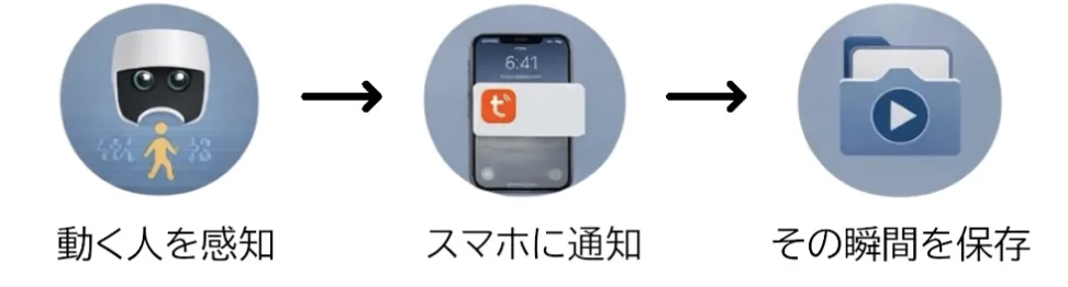 Equipped with a motion detection PIR sensor, it automatically starts recording when it detects human movement. Notifications are sent to your smartphone, and you can save the footage from that moment. Since you can check it on your smartphone later, you can feel at ease even when you are out.