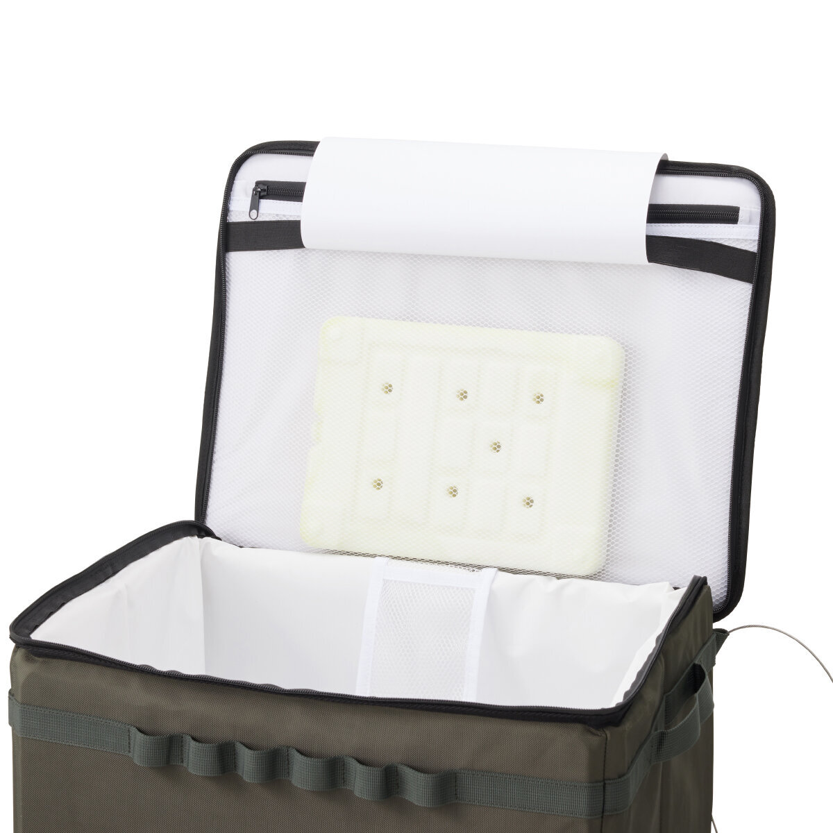 The major strength of the “LOGOS Delivery Cooling Box” is its overwhelming cooling capacity, inherited from outdoor gear. It is equipped with 10mm thick insulation material all around, effectively blocking the influence of outside temperatures. Additionally, the back of the lid features a dedicated large mesh pocket. By placing a separately sold ultra-strong cooling agent in the mesh pocket, the temperature inside the cooler can be kept even lower for an extended period.