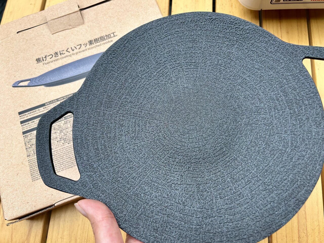 This time I got the smaller (20cm) version of the "camping multi griddle," which seems easy to carry. I was surprised by how light it is when I picked it up! When I weighed it, it came in at around 210g. It's about the same weight as the iPhone 17 Pro (206g).