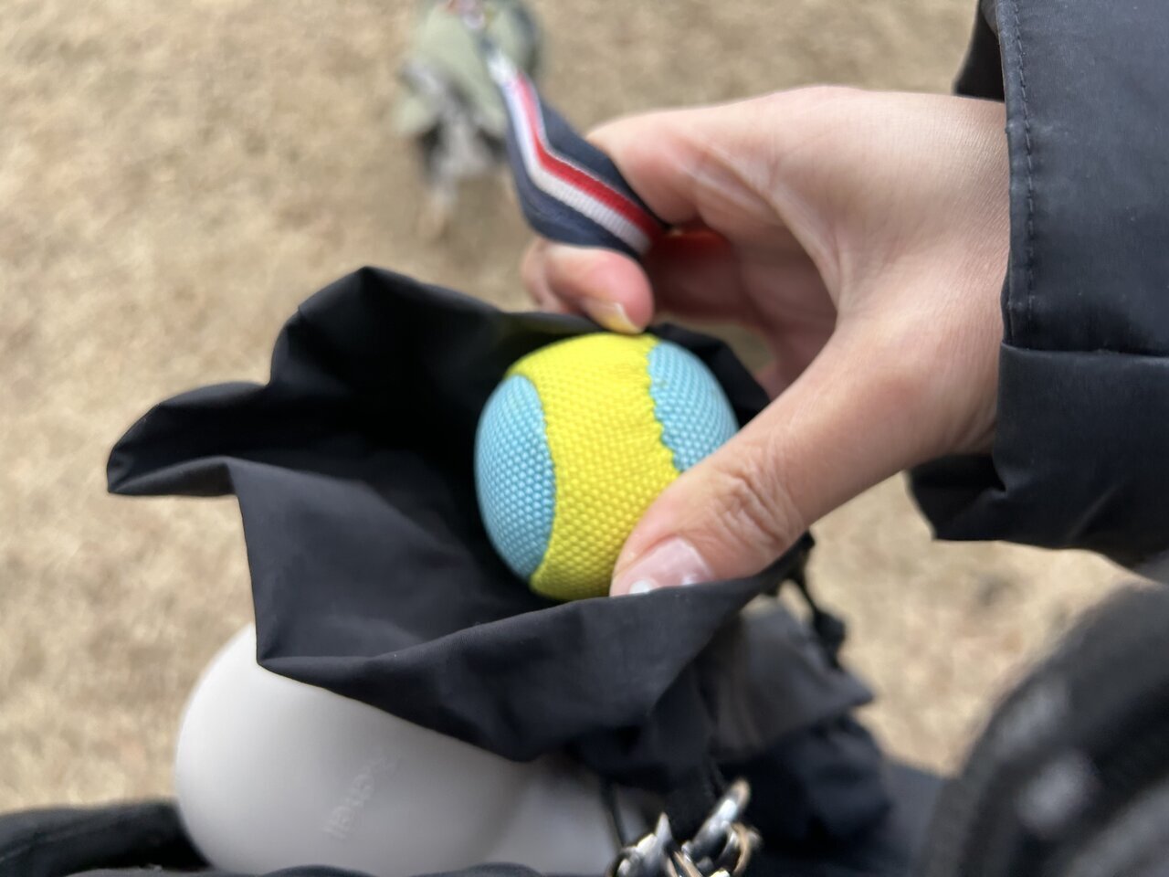 A must-have in a large park is playing with a ball. It allows you to smoothly take the ball out without keeping the dogs waiting who are insisting, "Hurry up and get the ball!"