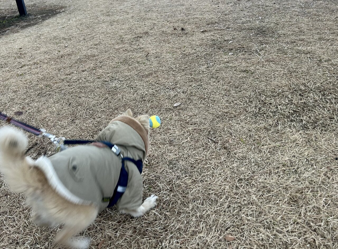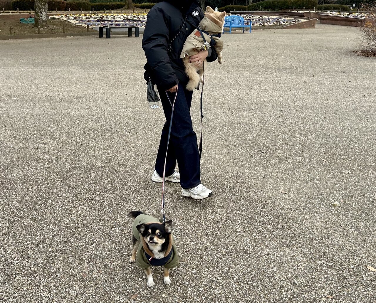This brings up the issue of walking while carrying one. Since there is a difference in stamina between my dogs, even if one is satisfied with the walk, the other still wants to play more.