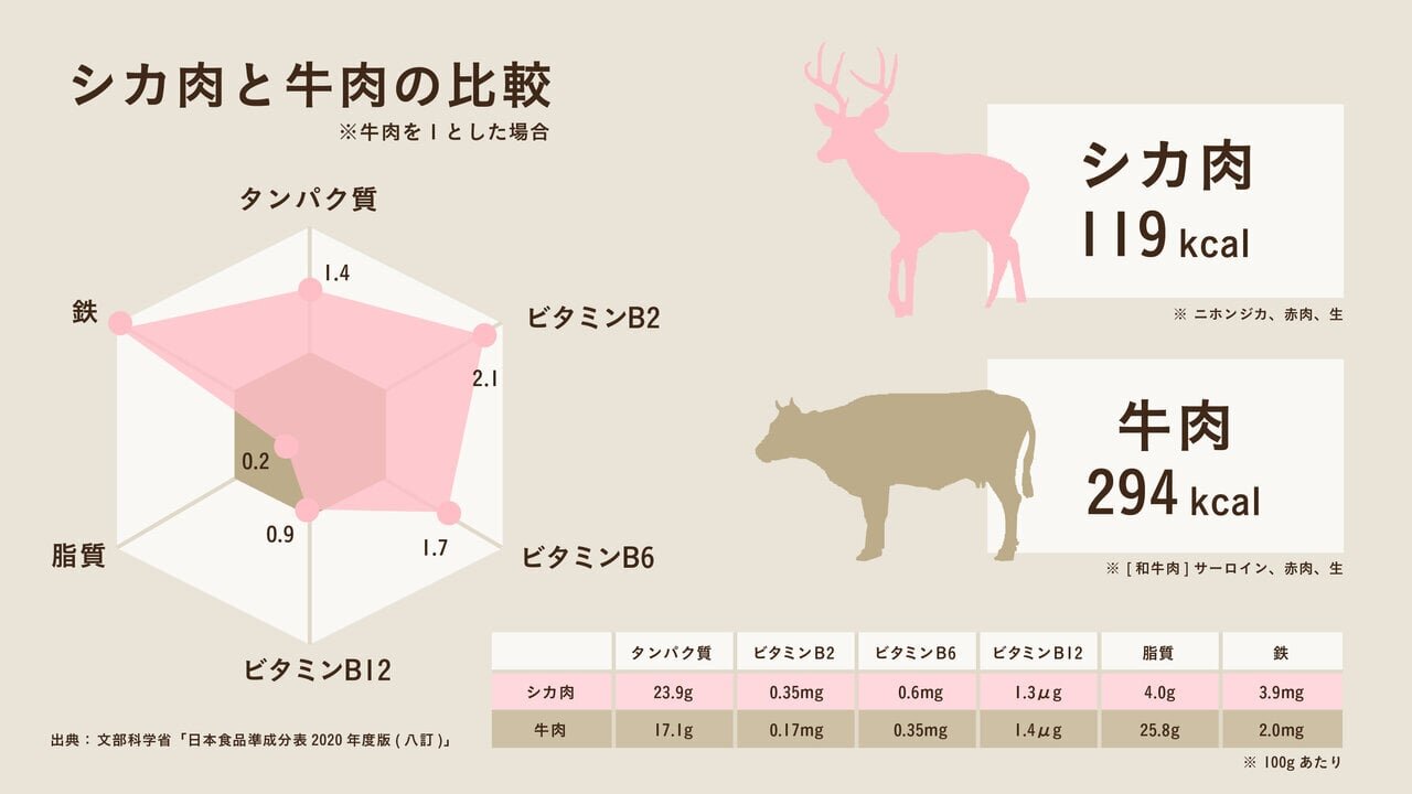 Low fat / About one-sixth of beef (4.0g of venison vs. 25.8g of beef per 100g)
