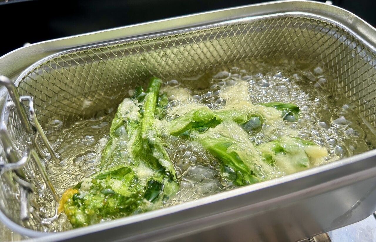 Finally, I threw in the canola flowers that had passed through the batter! The moment they hit the oil, it seemed the moisture hadn’t been fully wiped off, causing them to pop and sizzle. Thankfully, since I was wearing sleeves, I avoided any mishap, but just thinking about what might have happened if I had been in short sleeves sends shivers down my spine.