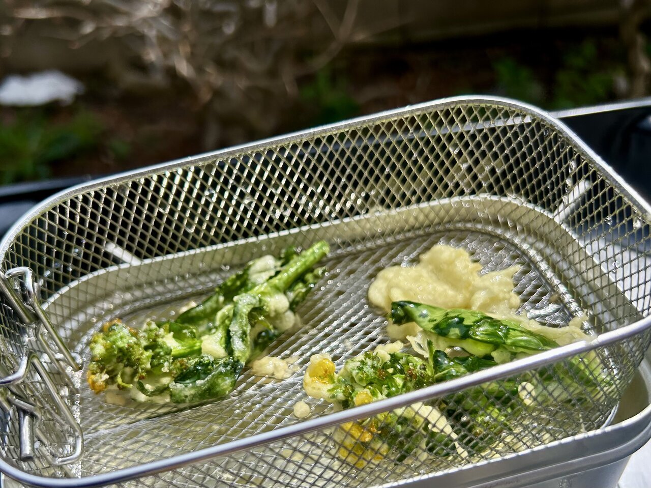 Just lifting the entire mess tin fryer made for a quick and easy draining of the oil! Even the delicate leafy tempura transferred beautifully to the plate. I can hardly believe how smoothly the tempura-making is going.