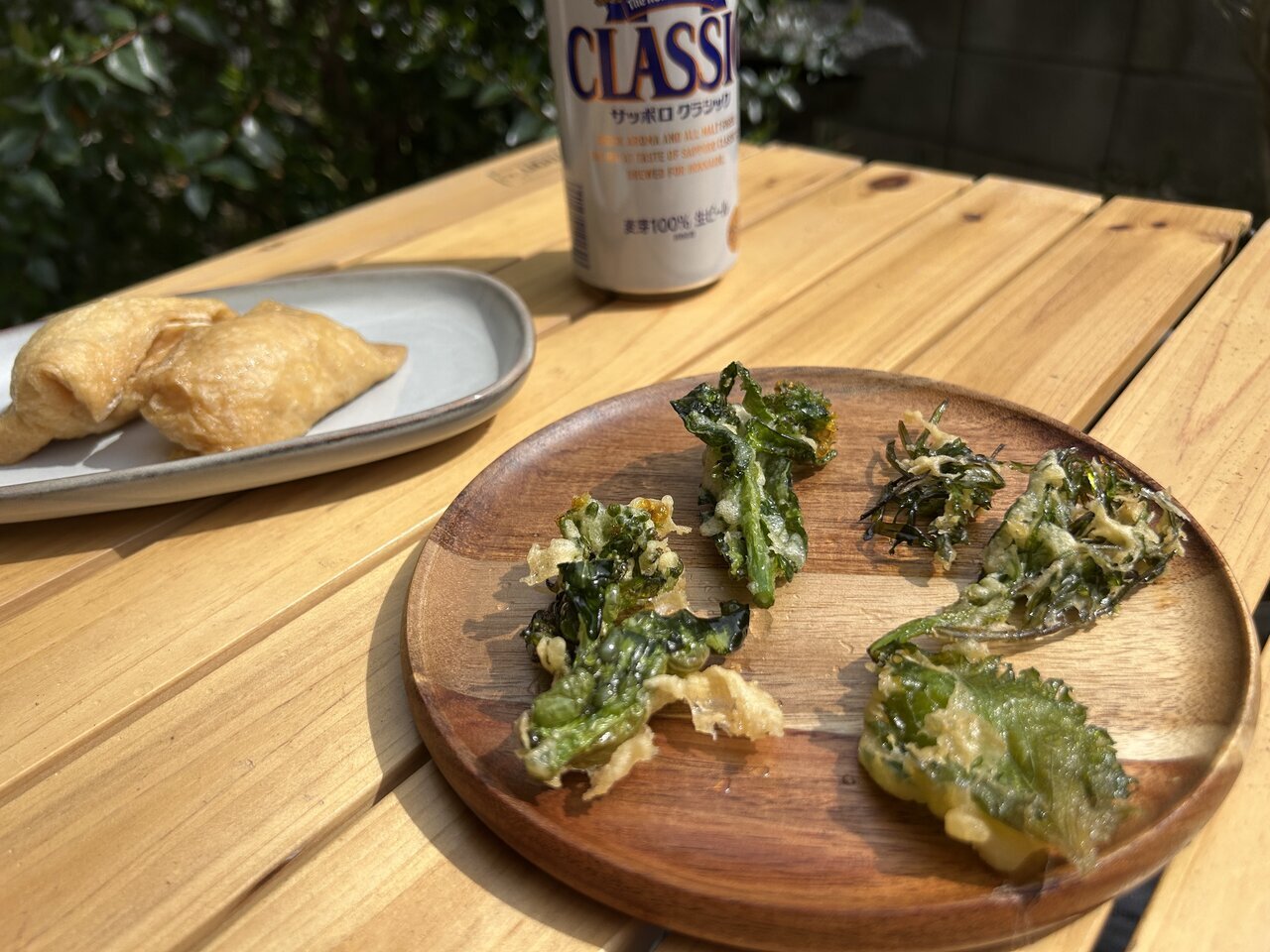 The tempura of seasonal canola flowers and watercress, wrapped in a crispy coating, is complete. Since it’s a special occasion, let’s enjoy it with the limited-edition beer from Hokkaido that my family gave me and some homemade inari sushi. Facing this perfect combination, I can’t help but smile.