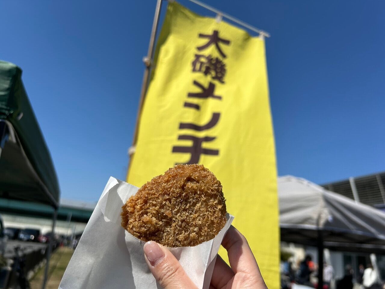 Since it's a special occasion, I want to enjoy the gourmet unique to Oiso. What caught my eye was the banner for Oiso Menchi. It seems to be handled by Meat House Sasaya, which was established in 1936. I was also curious about the croquettes, but I decided to buy the "Oiso Menchi" (120 yen).