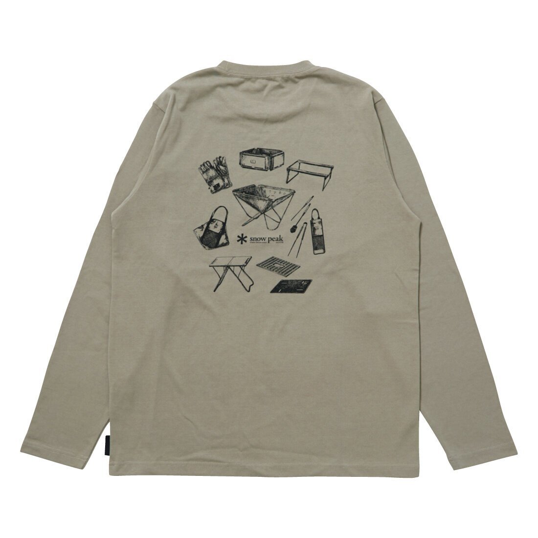 A long-sleeve T-shirt featuring gear printed for campfire gatherings, representative of Snow Peak. Perfect for the cooler seasons and irresistible for brand fans.