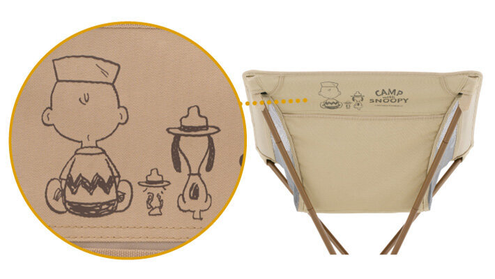 The front is adorned with an embroidery of Snoopy and Woodstock, the Logos "SNOOPY Bucket Chair-BF". The backside depicts Charlie Brown, Snoopy, and Woodstock from behind, making it feel cute from any angle. The fabric has a high-quality canvas-like feel.