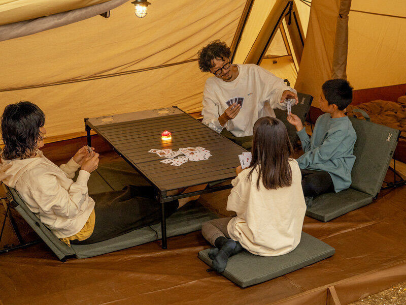 A camping style where you take off your shoes and spend time inside the tent or on the living seat, commonly known as the "tatami style." It has a luxurious feel like glamping and is currently popular as a setting where children can play freely and safely.