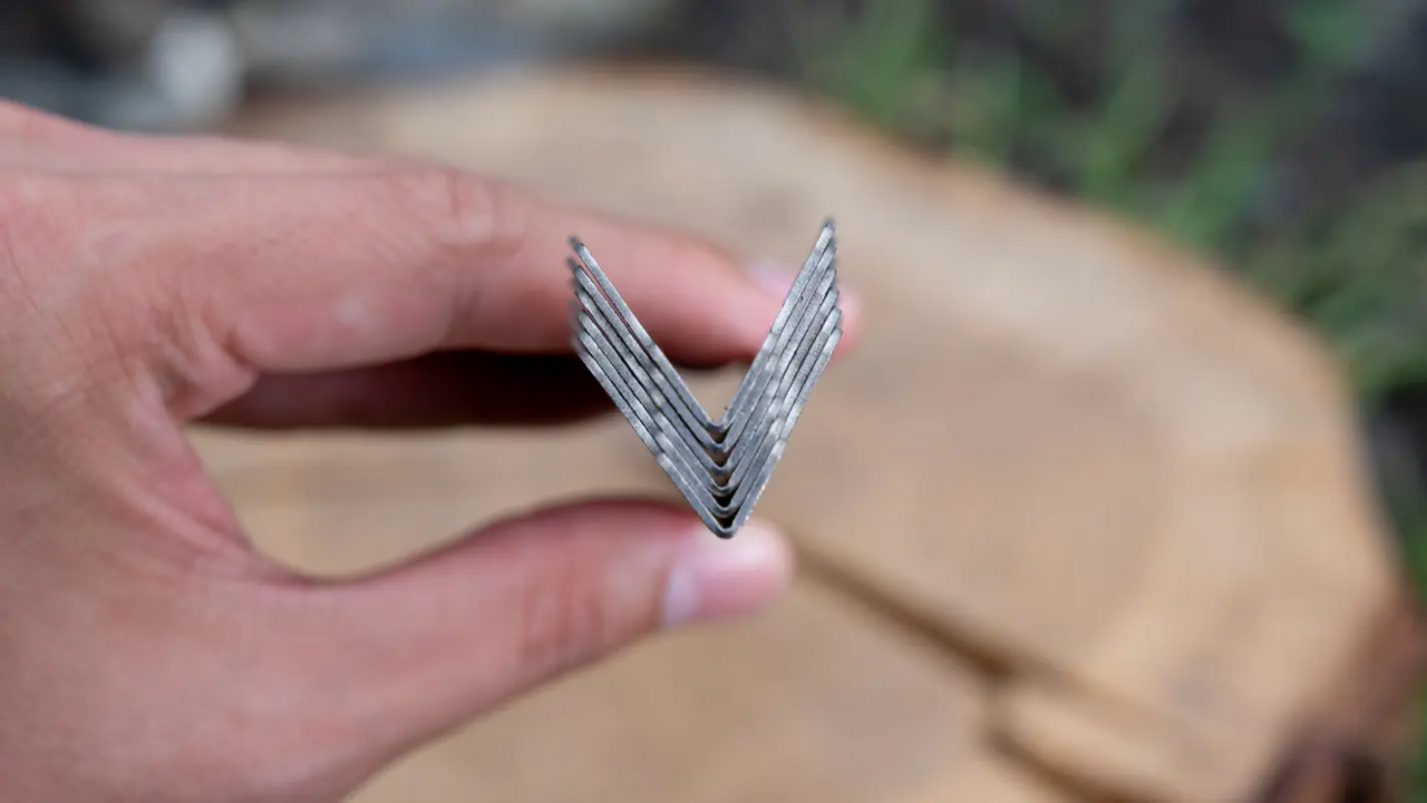 As shown in the photo, it has an ultra-thin design with a thickness of about 1mm. It overlaps perfectly in a V shape, so even when stacked six high, it's only about 6mm thick, which is impressive. You can easily slip it into the gap of a backpack or pouch, making it less likely to interfere with bulkier tools.