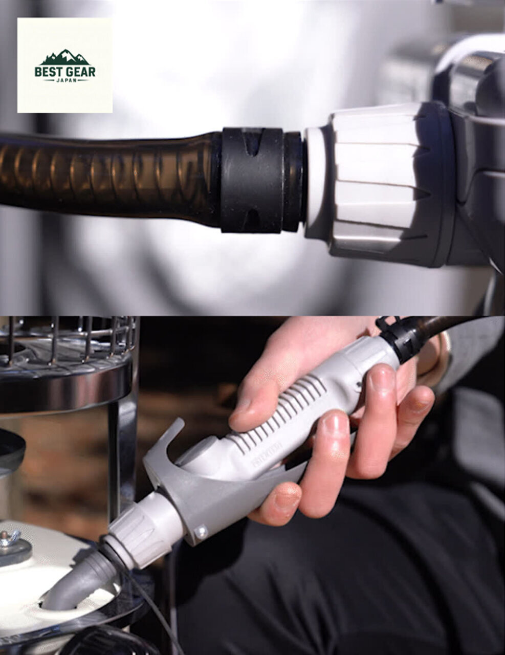 Outdoor stoves often have very narrow fill openings that do not accommodate standard nozzles. This set features a nozzle at the end of the hose that is narrower than typical commercial products, making it compatible with most fill openings. Proudly manufactured in South Korea, where temperature variations are even more extreme than in Japan, it provides powerful performance, even in sub-zero conditions.