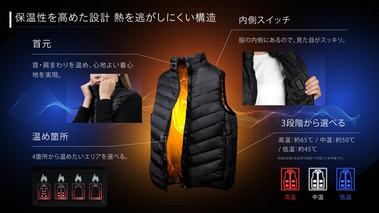 With a total of 17 heating panels built into 4 zones—neck, shoulders, front, and back—you can freely choose the area you want to warm up. The temperature is adjustable in three stages: approximately 65°C, 50°C, and 45°C, and it can be easily switched with a button press. The LED color indicator makes it convenient to see the set temperature at a glance.