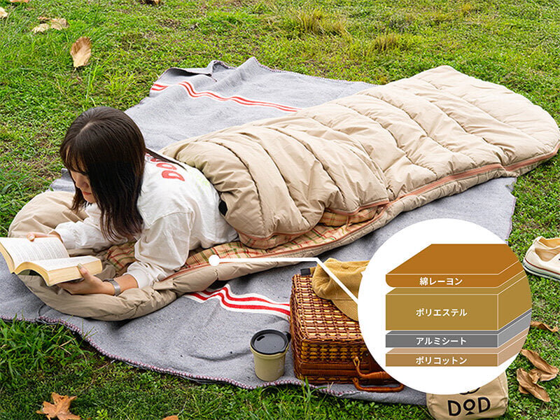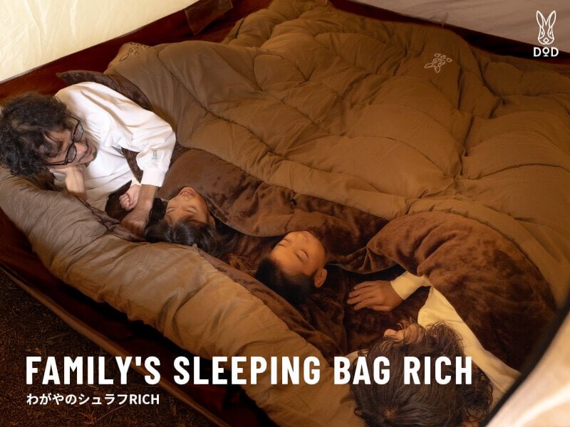 Newly released from the outdoor brand DOD, "Wagaya no Shuraf RICH." This is the autumn-winter model of "Wagaya no Shuraf," which has been on sale since 2017, a one-piece sleeping bag that allows the whole family to sleep together. It has been upgraded with blanket material, a hood, and a neck warmer, making it an extra-large sleeping bag that you can sleep soundly in even during the cold season.