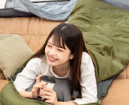 The envelope-type sleeping bag "SBE-02" features a soft fleece material that feels nice to the touch. Even on chilly nights, it feels warm as soon as you touch it and prevents cold from returning right after you fall asleep. The filling consists of hollow fiber that traps air, providing a good balance of lightness and insulation. The comfortable temperature range is -5 to 5°C (varies with filling amount), and the limit temperature is -10 to 0°C (same), making it suitable for winter use.