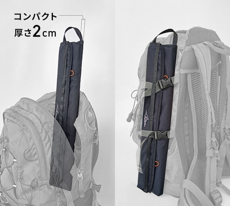 The thickness when stored is only 2cm. With a slimness comparable to a smartphone, it fits smoothly into the gaps of a backpack, making it ideal for solo camping or motorcycle touring. All necessary parts are contained within the two tabletop panels, resulting in a compact, flat shape without any protrusions.