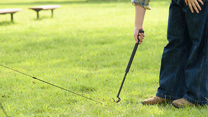 "Mehurire POM" is a gear that reduces strain on the lower back during pack-up at the campsite. When in use, simply hook it to a peg, gently compress the shaft once, and slide it towards you. It operates with the leverage and the shaft's rebound, allowing you to pull it out with a "pop" while standing.