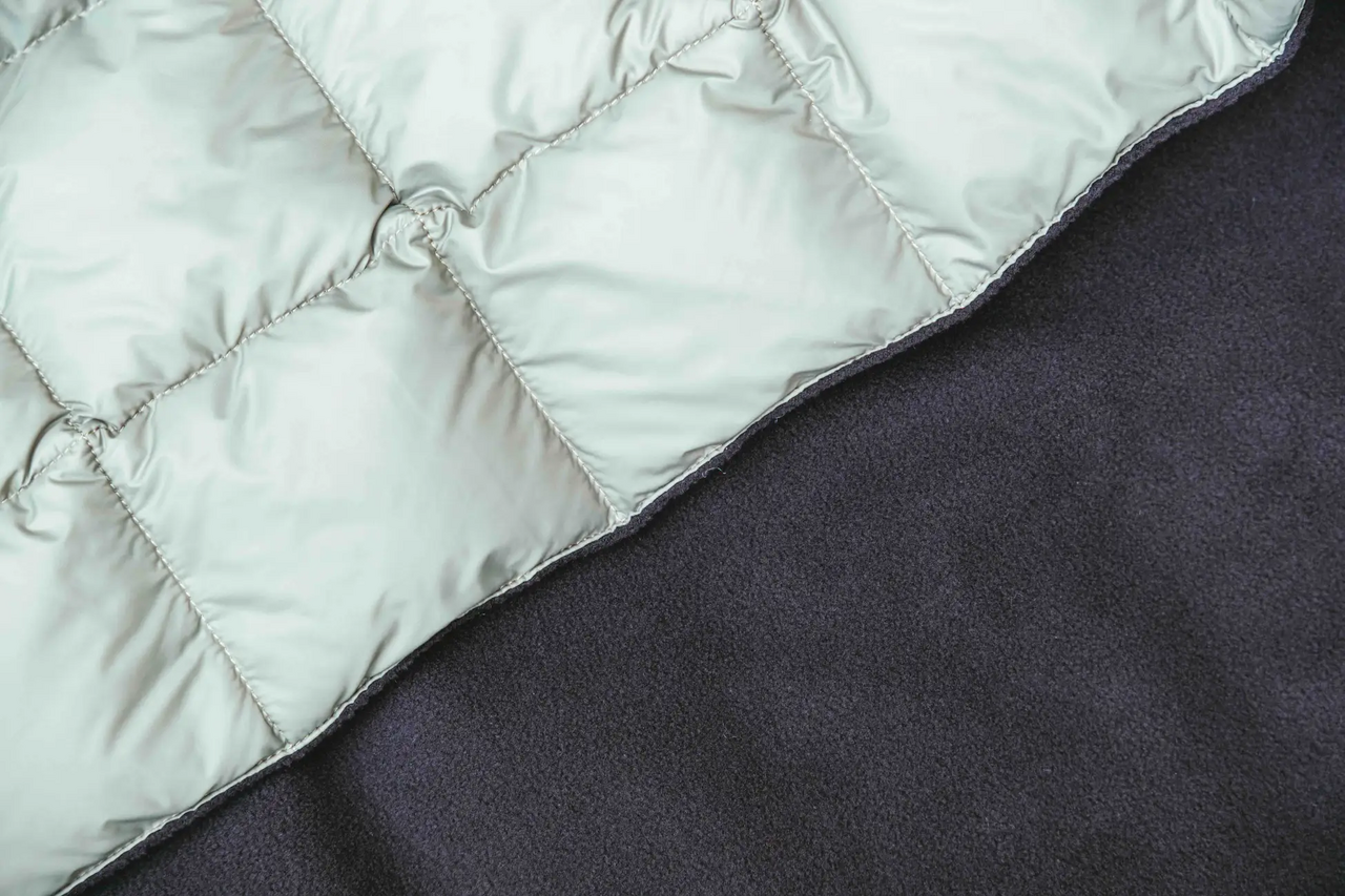 The "Wide Down Blanket," a collaboration limited item between CAMP HACK and TAION. The surface is filled with 800FP down, and the reverse side features fleece material, making it double-sided.