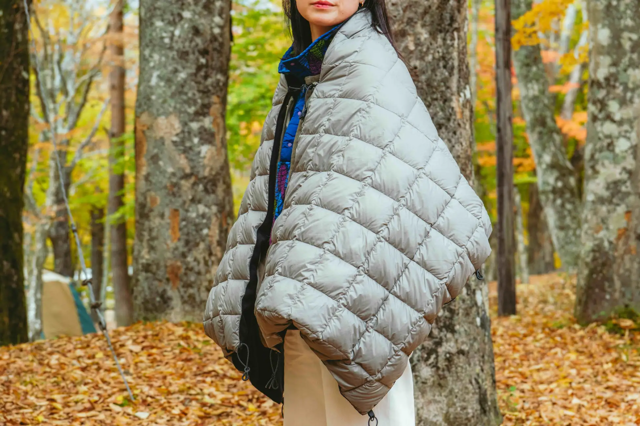 Moreover, when wrapped over the shoulders and secured at the front with fasteners, it becomes a poncho that stays in place even while moving. With just one "Wide Down Blanket," you can enjoy warm times during winter camping.