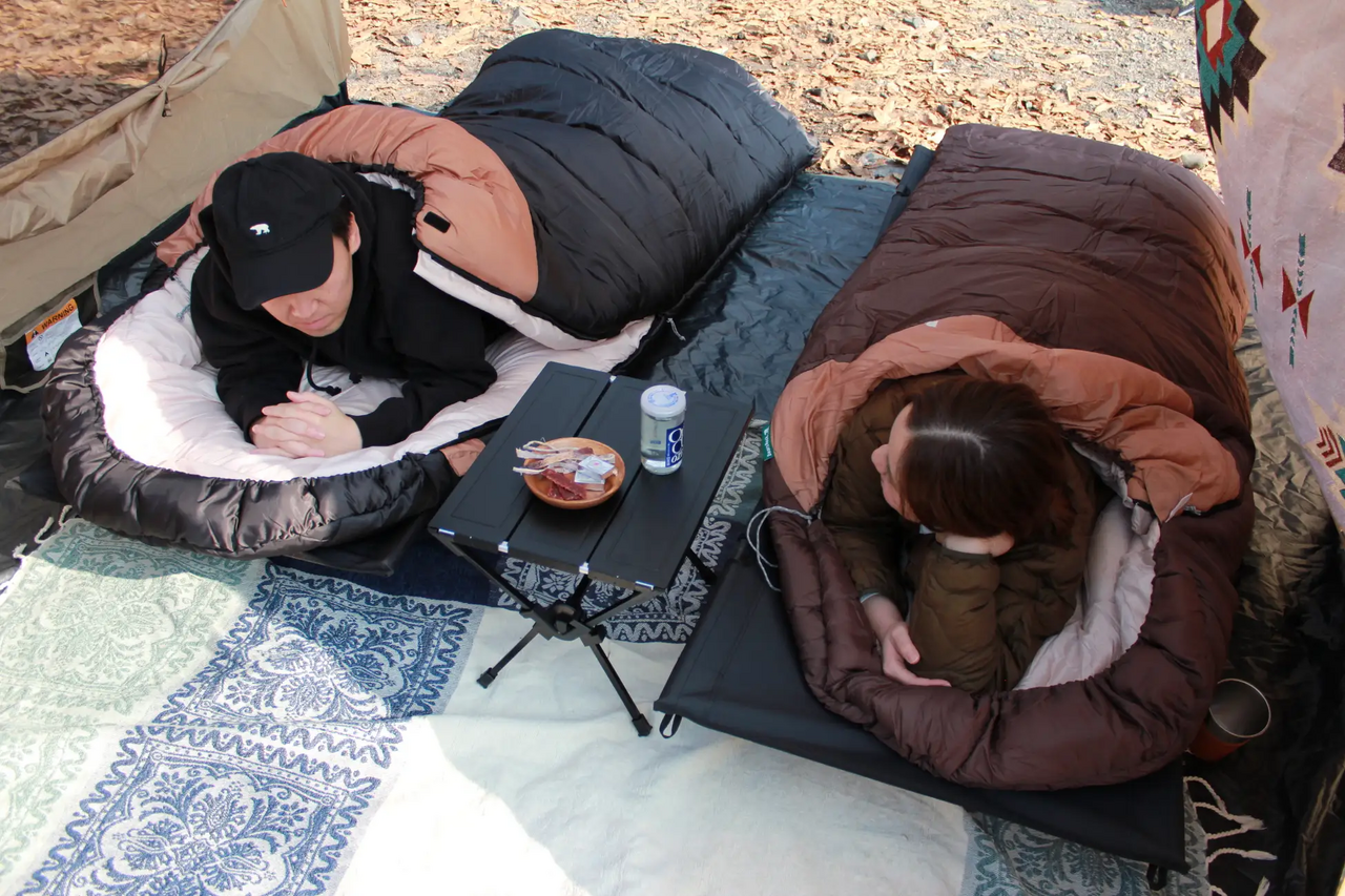 How to sleep warmly is the key point that affects the satisfaction of winter camping. On days when a regular sleeping bag might feel a bit cold... I recommend the "Bears Rock Envelope Sleeping Bag -30℃" that allows you to sleep feeling like you're in a futon. It's spacious and roomy for a sleeping bag!