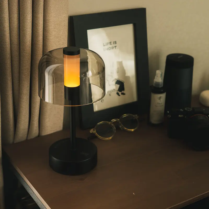 The "fave mood lamp" is a mood lamp that evokes the ambiance of a campsite at night simply by dimming the room's lights. Instead of shining a strong light, it is set to softly envelop the area around you and the table with a gentle brightness, making it suitable for leisurely activities like reading, enjoying music, or spending time with family.