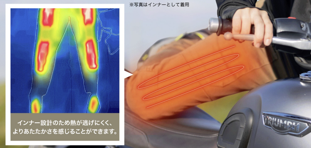 The "PowerArQ Voltera Pants" are electric heated inner pants that can warm from the thighs to the shins and toes. Notably, they feature an integrated shape that envelops the toes. By using highly elastic materials, they retain warmth and support free movement during riding.