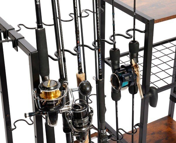 It also features a stand function that can hold up to 12 rods vertically. The design accommodates a wide range of types from bass rods to shore jigs, reef rods, and boat rods. The wooden end boards with non-slip features and brackets with rubber covers gently support the rods and prevent tipping or falling.