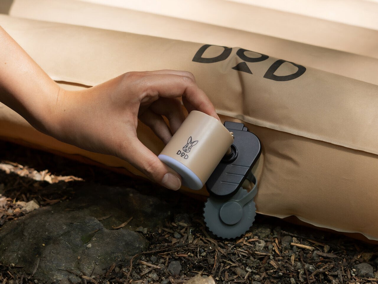 Setting up an air mat surprisingly consumes a lot of energy. The "Sotone no Air Pump" minimizes that burden. Despite its palm-sized compact body, it combines three functions: inflating, deflating, and an LED lantern.