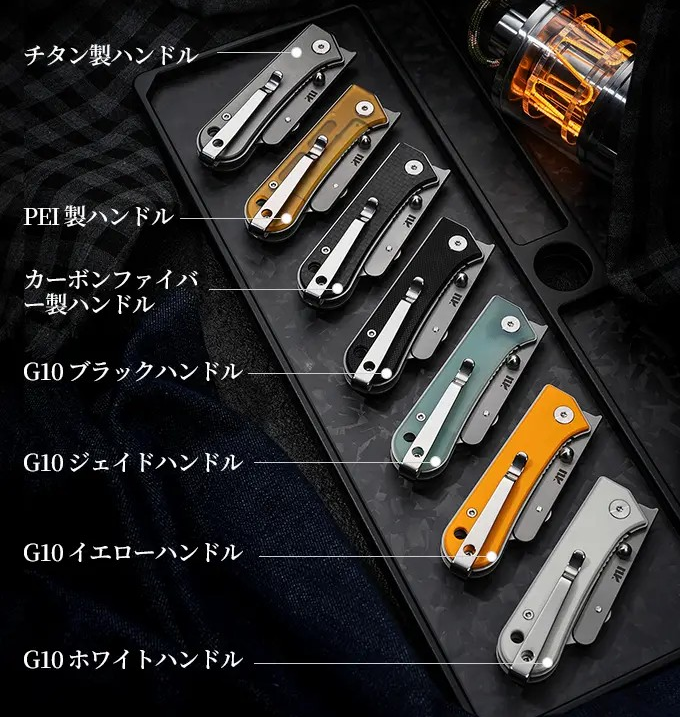 The handle materials are varied. Available in four types: titanium, Ultem (PEI), carbon fiber, and G10. You can choose according to your preferences and usage scenarios.