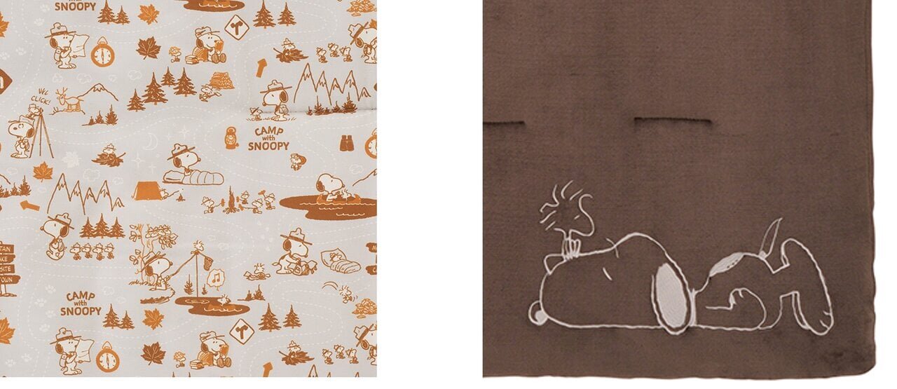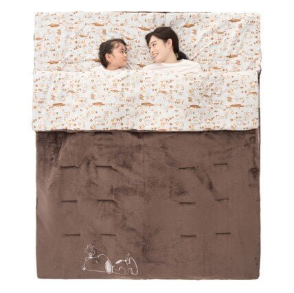 The "CAMP with SNOOPY" series, depicting Snoopy and Woodstock enjoying camping in nature, welcomes a washable, reversible sleeping bag, "SNOOPY Soft and Warm Sleeping Bag - 0".