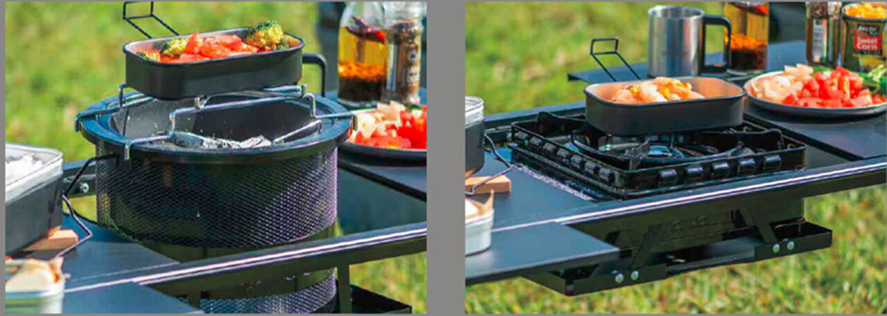 The "Outdoor System Table" is a unit that expands outdoor freedom. It has a structure that allows you to install a shichirin or butane stove in your preferred position, enabling layouts that suit your cooking style. By attaching the top panel to the side, the table can also be expanded.