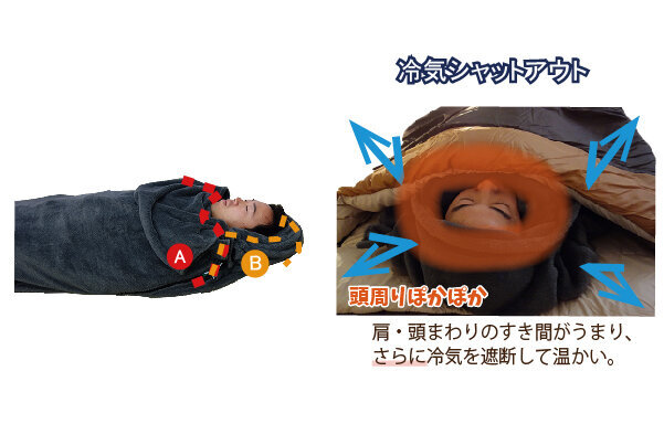 The base sleeping bag features the openness unique to envelope types and a fluffy texture like a futon. It is designed wide, with a width of about 90 centimeters, eliminating the cramped feeling often experienced with standard mummy-shaped sleeping bags. You can easily turn over inside even while wearing thick winter clothing, and there is plenty of space at the foot. It utilizes a unique "BR Warm" material that retains a lot of air in the filling, achieving a reassuring sleeping experience that feels like being wrapped up.