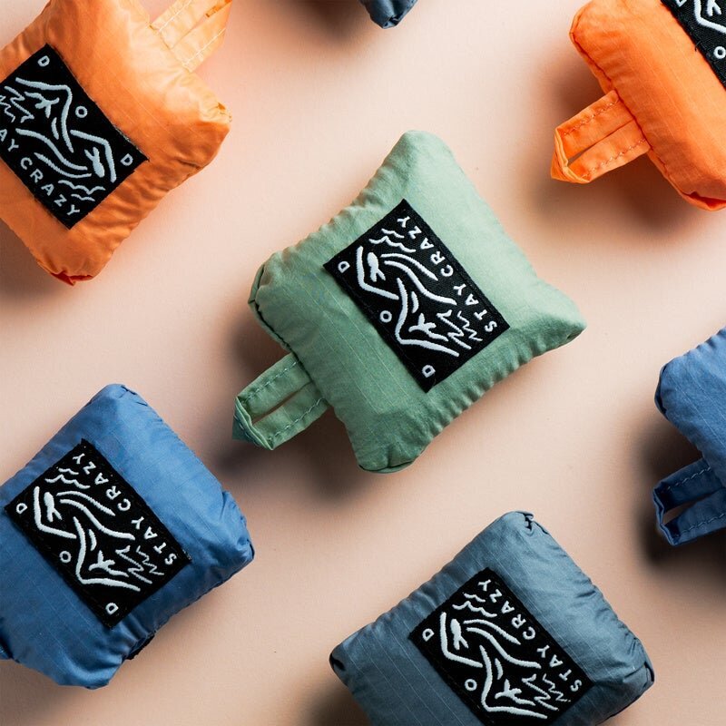 The "Pokesack" and "Pokeshiba" are designed to be packable, able to be crumpled and stored in the stretch mesh pocket inside the main body. When stored, they take on a rounded shape wrapped in vibrant mesh, making them charming even when placed in a bag or hung from a carabiner.