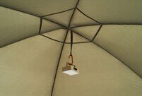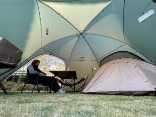 Inside the dome, there is ample space even with a table and chairs for m8 people. When used as a standalone screen tarp, it can create a spacious area that can accommodate a one-person tent. Additionally, the hexagonal structure integrates livability with wind resistance. Contrary to its size, setup and takedown can be done smoothly.